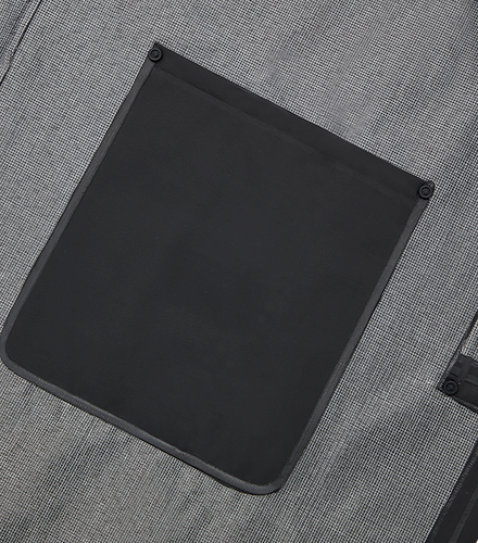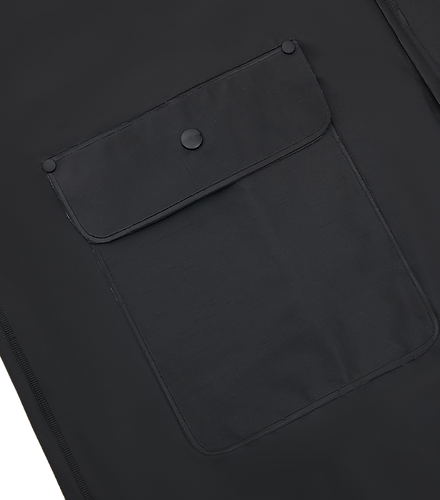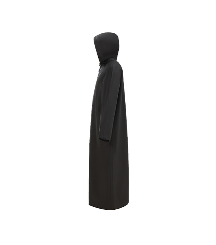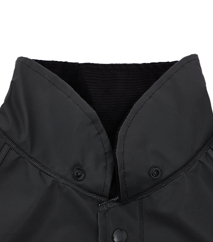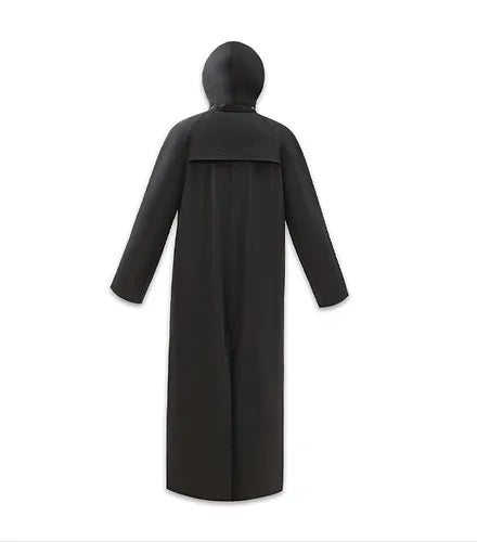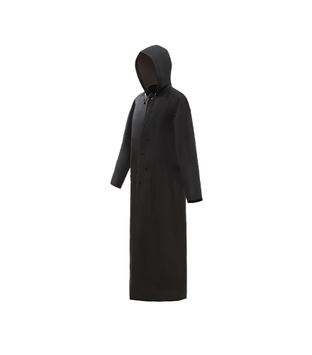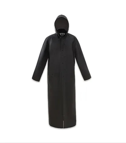 Long rain coat with unisex closure, detachable hood, storm-fly front with duracon snaps, and full corduroy collar for extra comfort. Coat has one outside flap pocket, one inside pocket, and cape ventilated back. Snaps on lower legs to prevent flapping