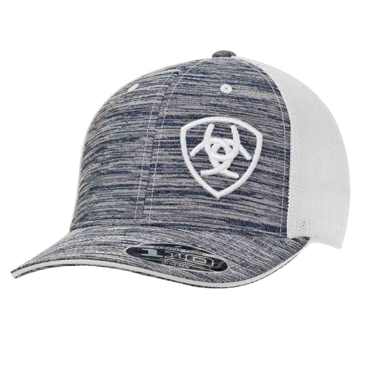 This Ariat mens cap by M&F Western Products® features a grey heather front with a white offset Ariat shield logo. The back consists of a white mesh snap back. The sweat band has the Flex Fit 110 Technology for a comfortable and adjustable fit.