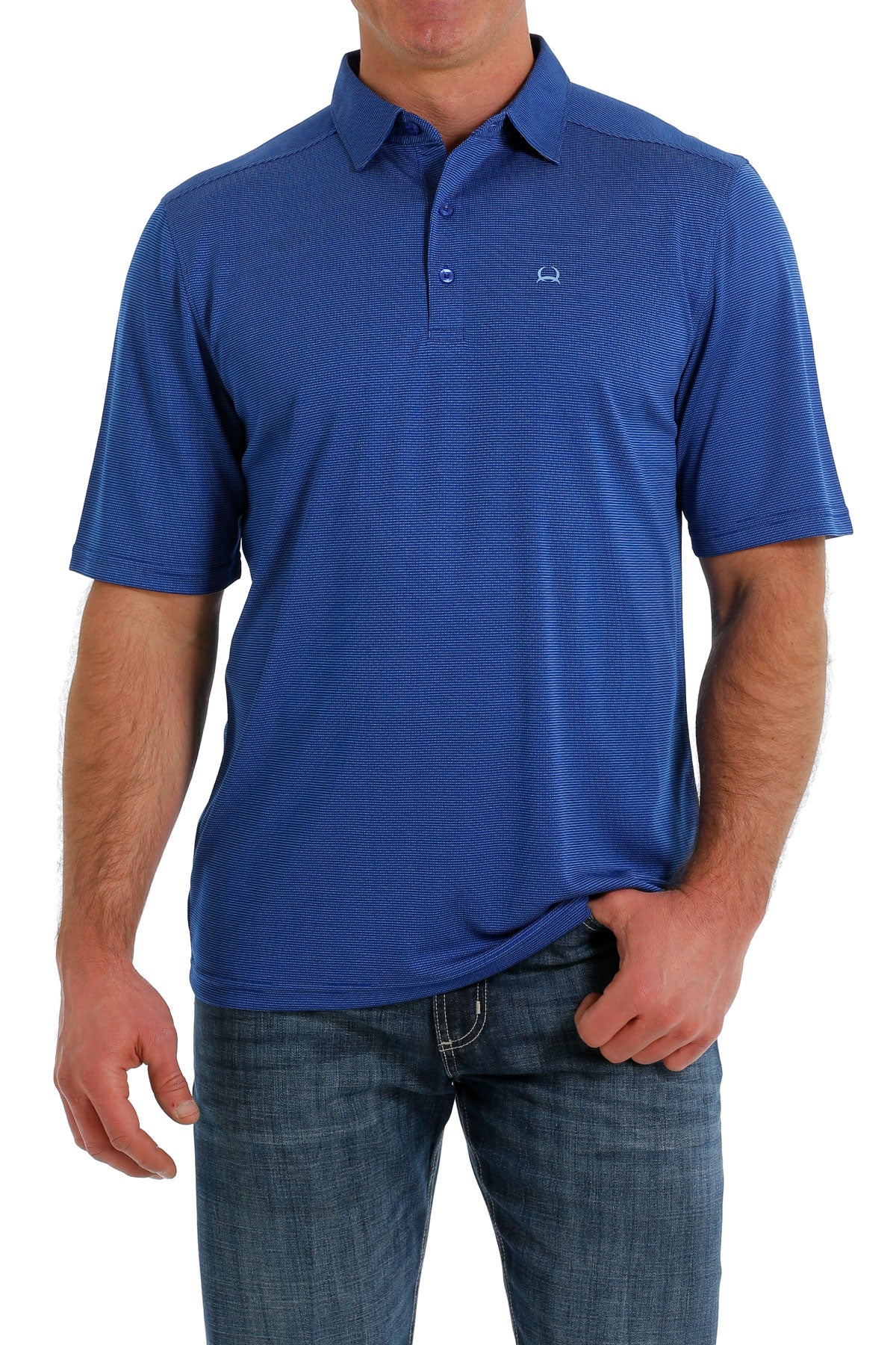 Cinch Arena Flex button polo, royal blue print, short-sleeve, performance Arena Flex, wrinkle resistant, moisture wicking, light weight with UV defense. Machine wash cold, tumble dry low.