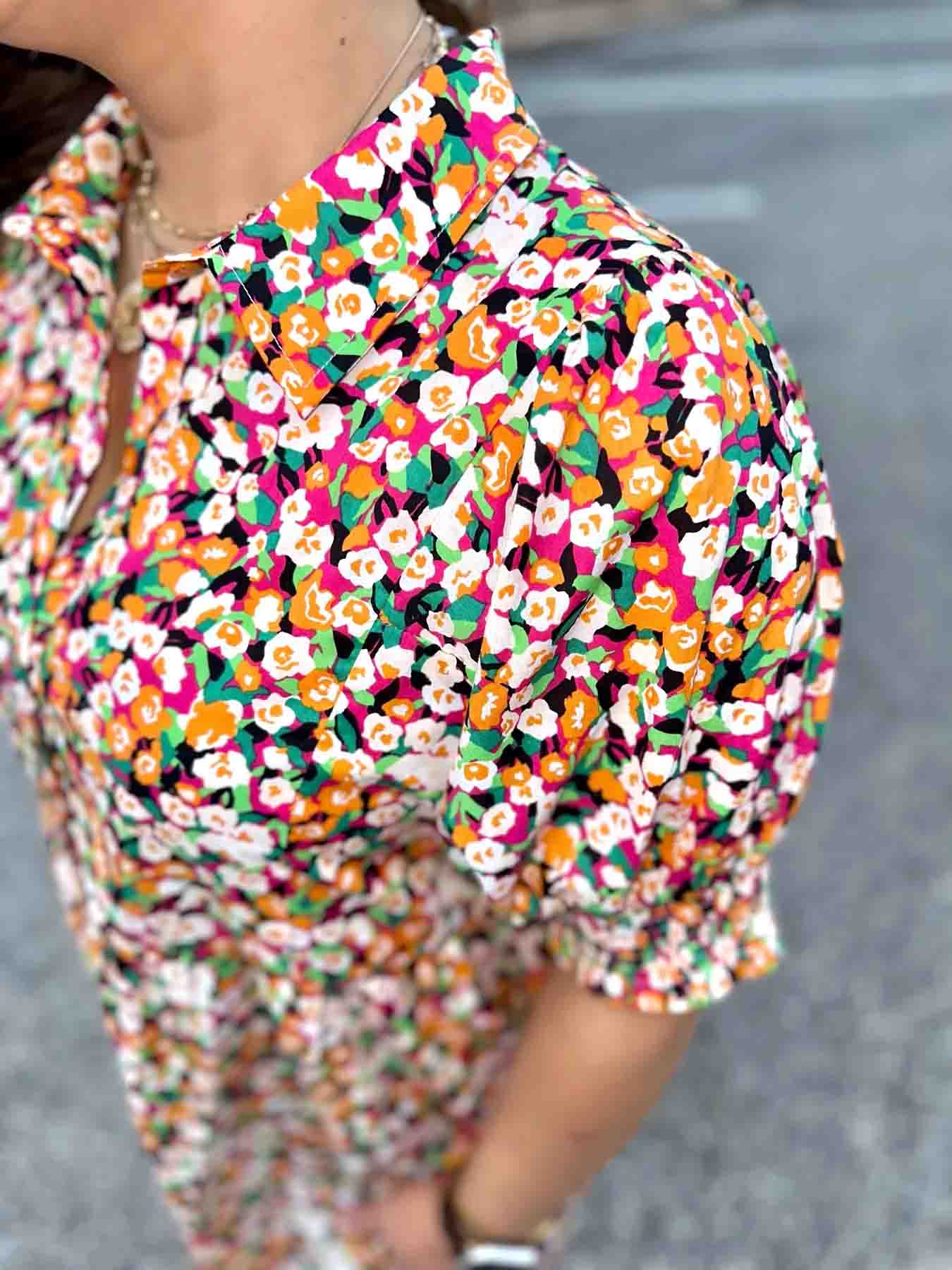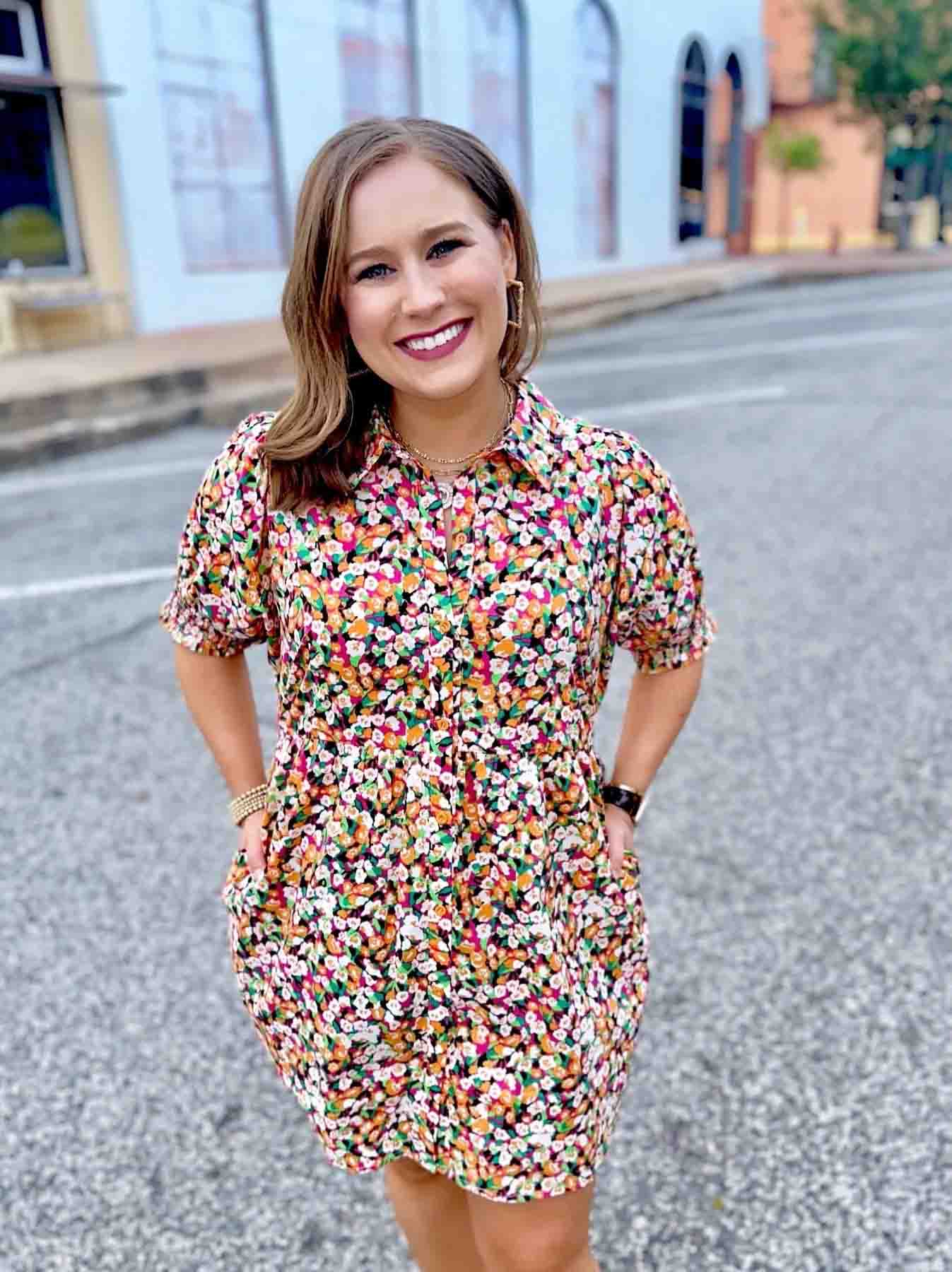 The Eliza Floral V-Neck Dress is the perfect way to stay on-trend this season. Featuring an a-line design, collared button-down front, pockets, and stretchy smocked short sleeves, this dress is both comfortable and stylish. The vibrant floral print includes all the top colors for the season.