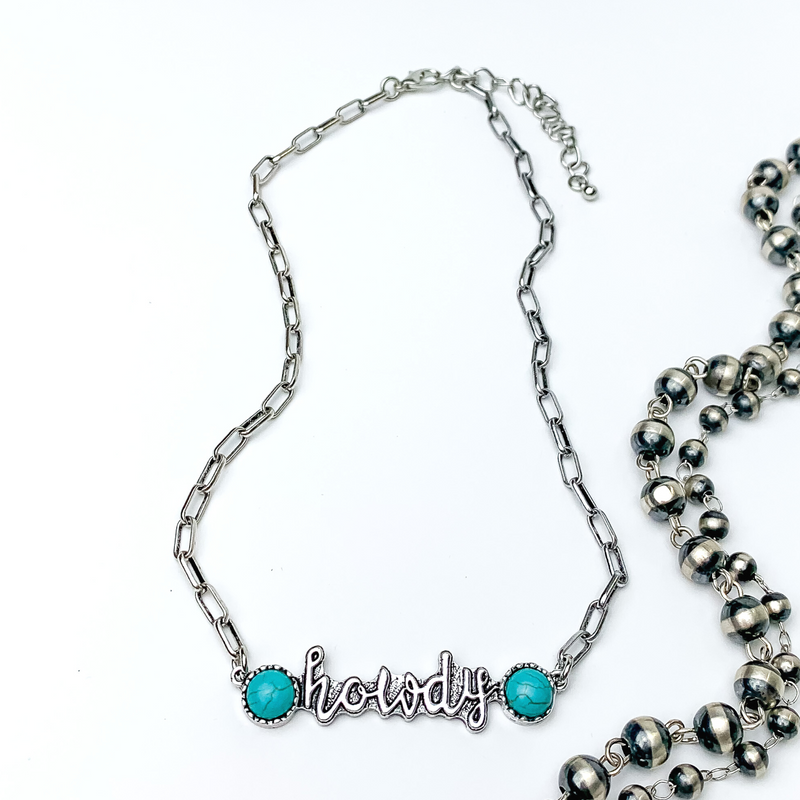 Single silver Howdy Necklace with post style turquoise stud earrings.