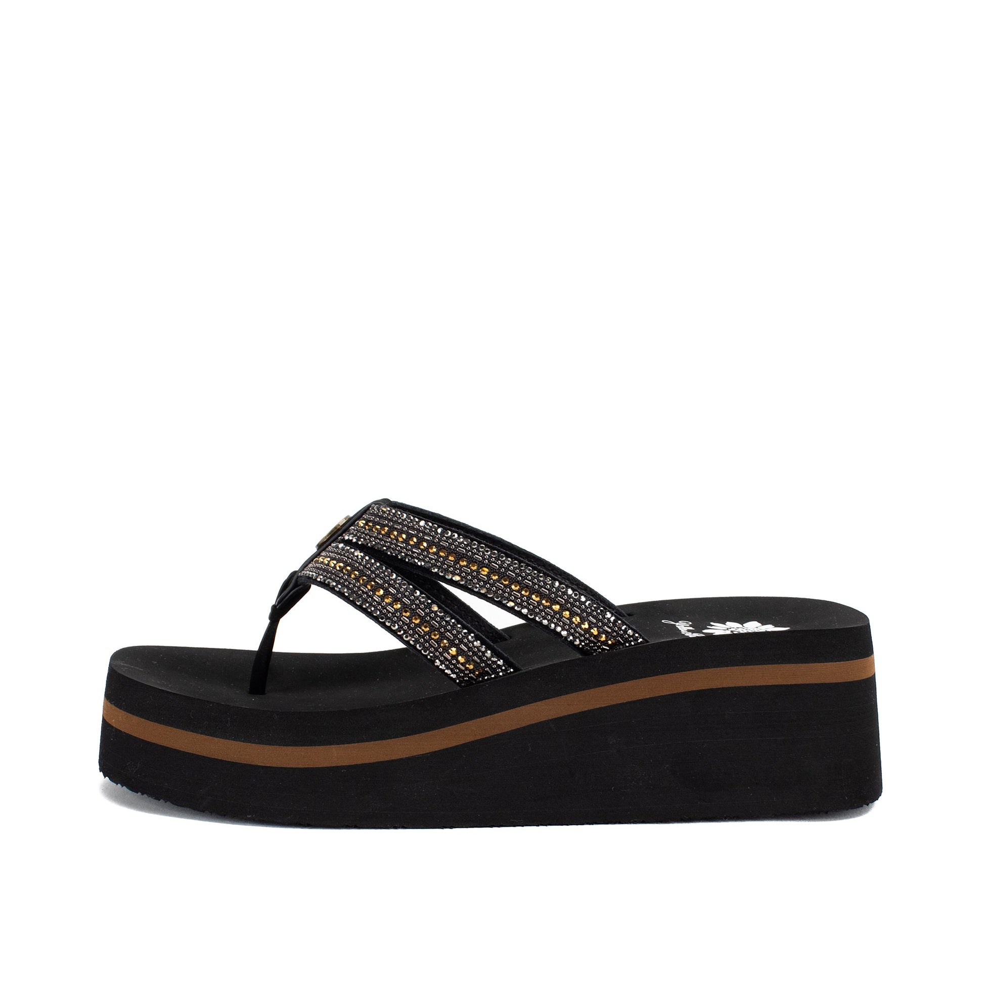 KRISTA is a lightweight flatform that features a double-strap upper adorned with sparkling rhinestones and an adorable center logo stud. This sandal bottom has a medium-height wedge and a contoured footbed for comfort with every step.