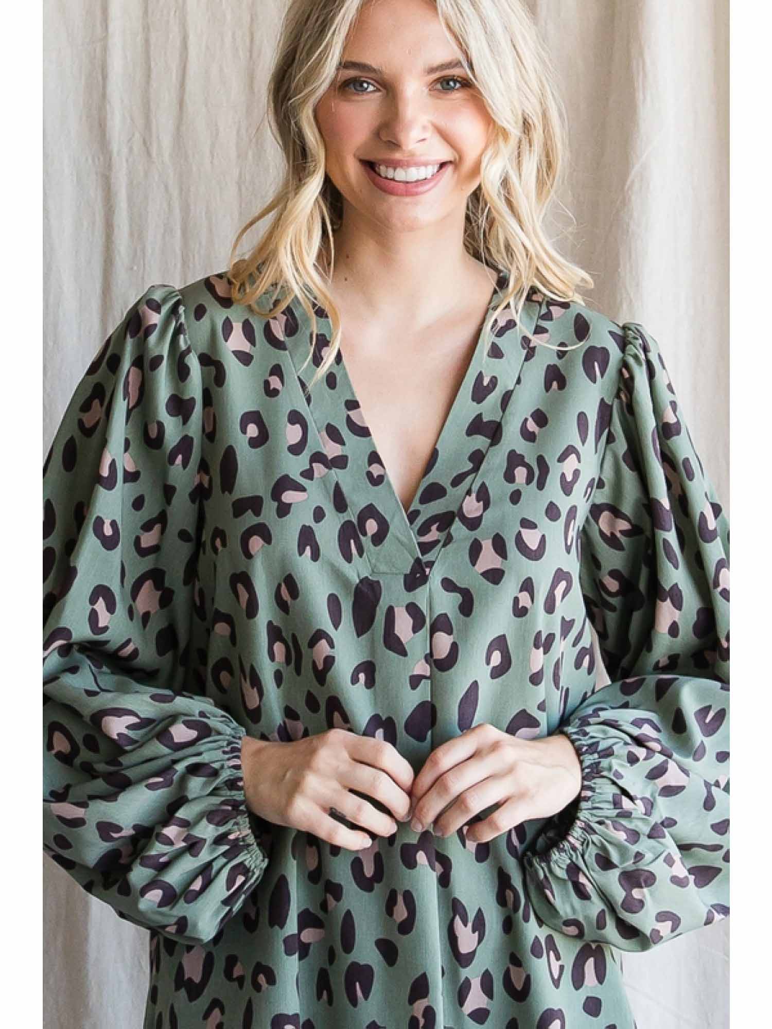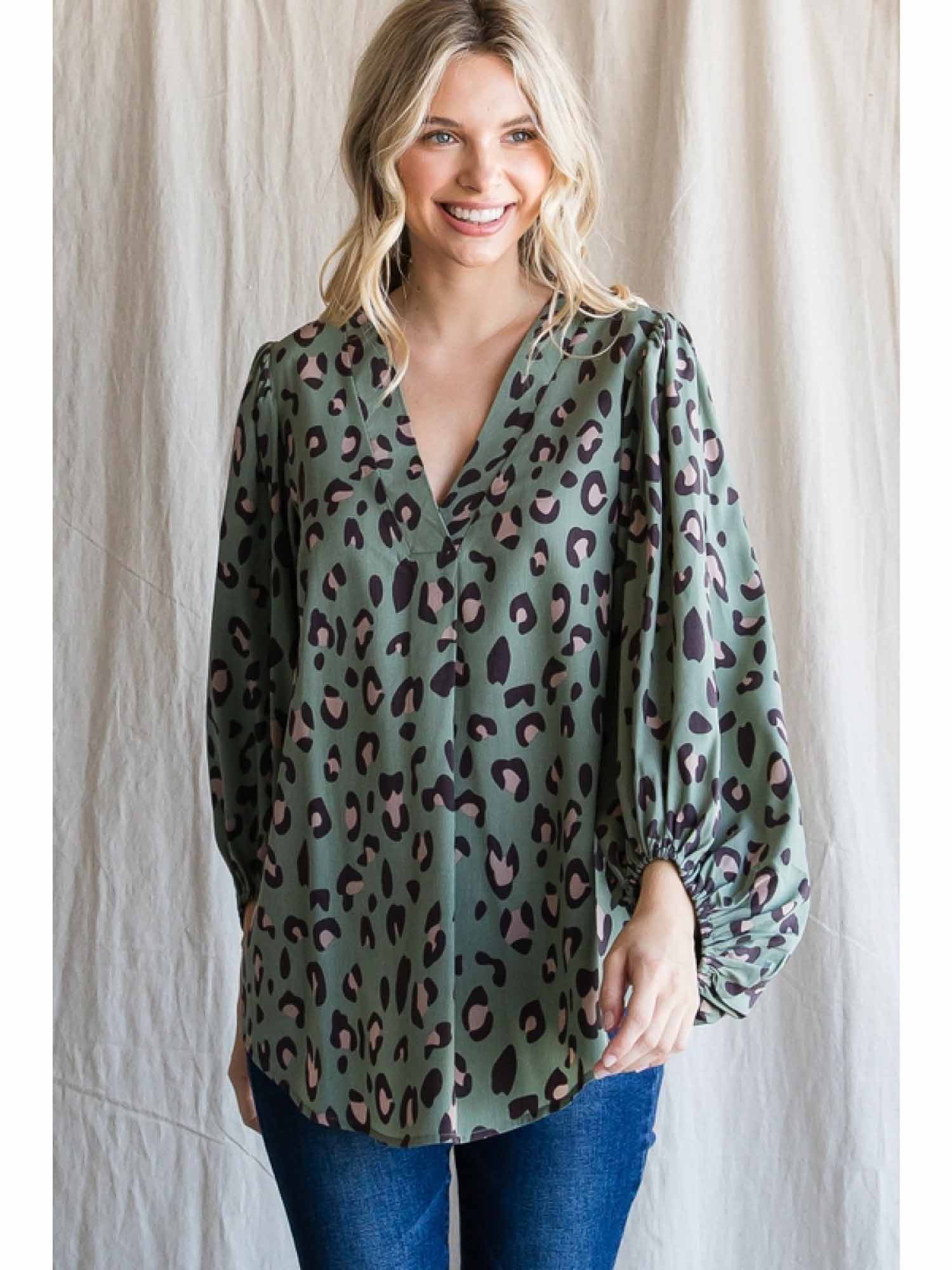 Leopard Print V-Neckline Top with Bubble Sleeves by Jodifl