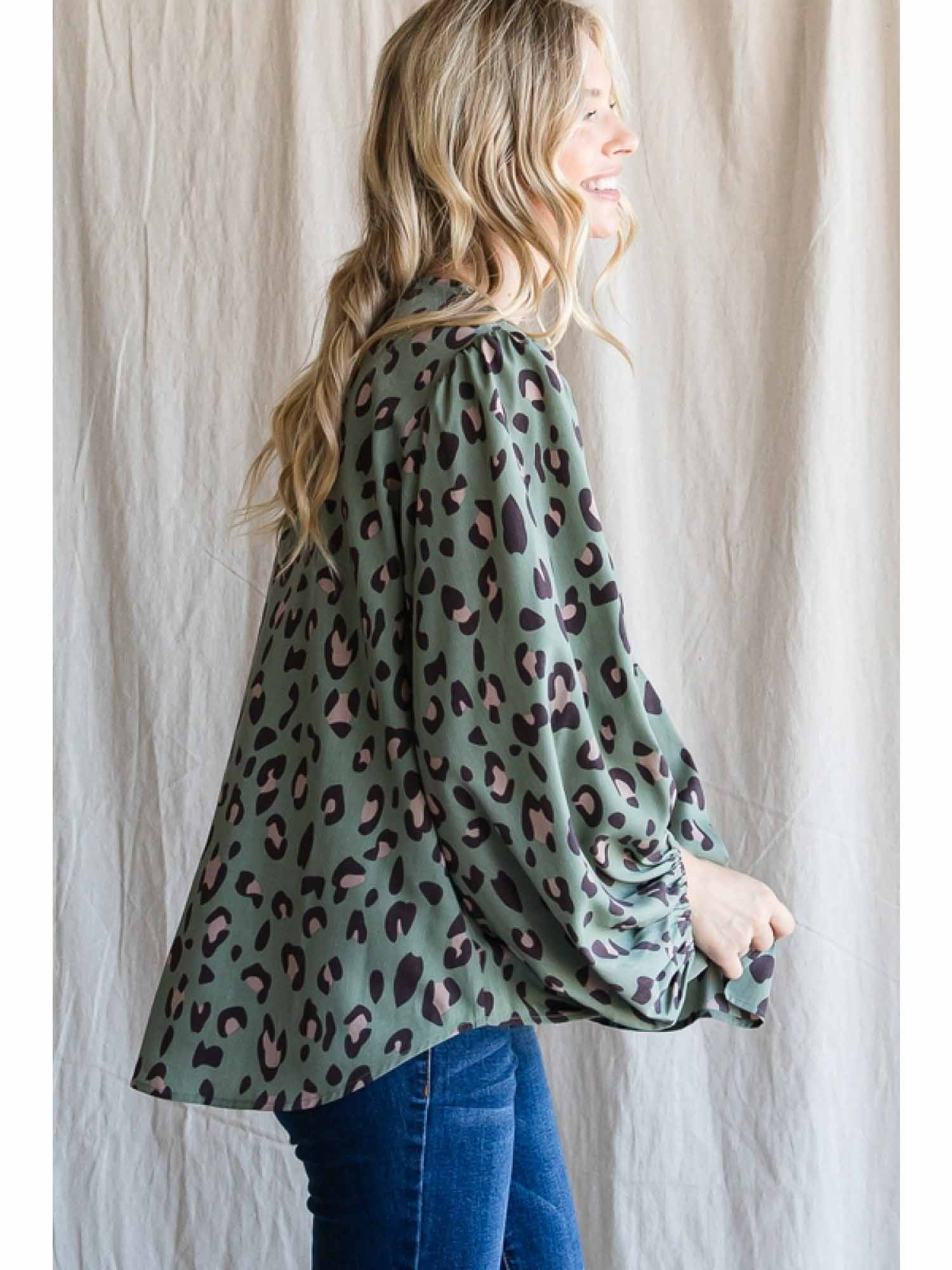 Leopard print top with a V-neckline and long draped bubble sleeves.