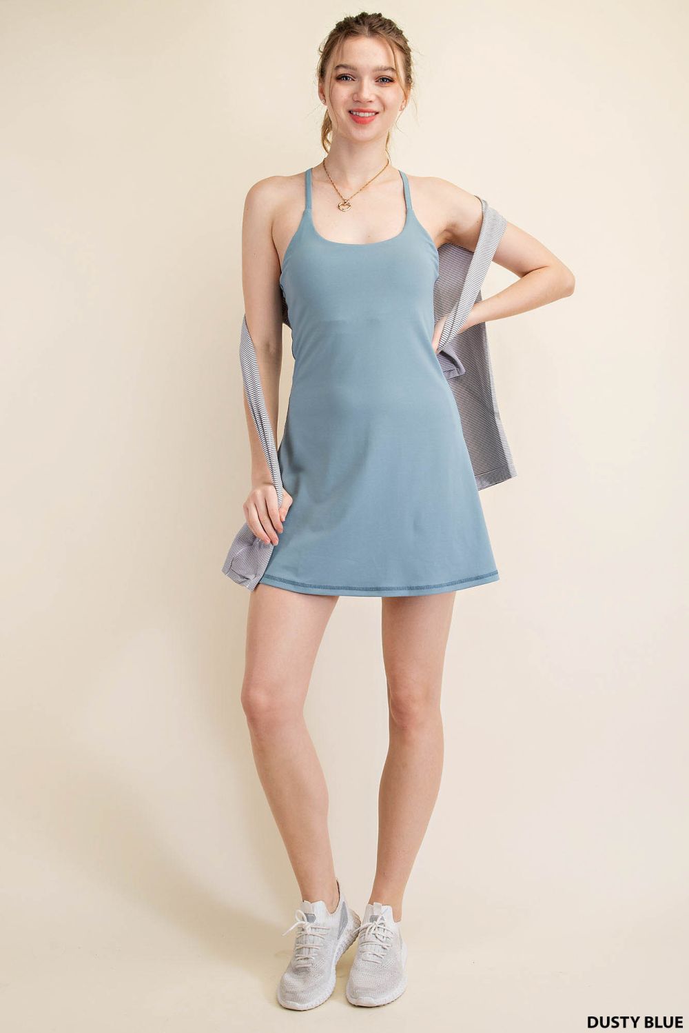 Sport Dress with stretchy athletic fabric with attached shorts leggings.