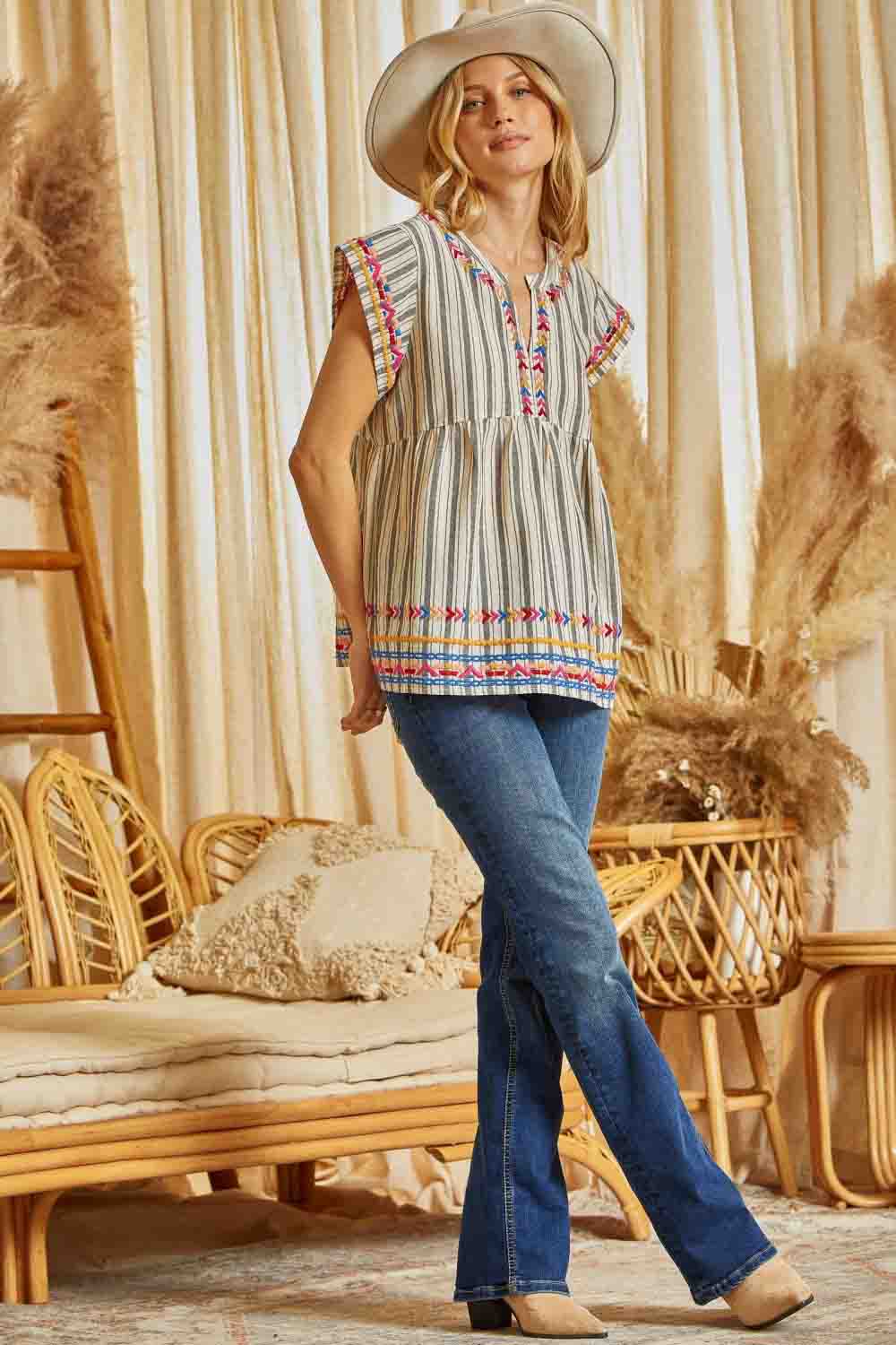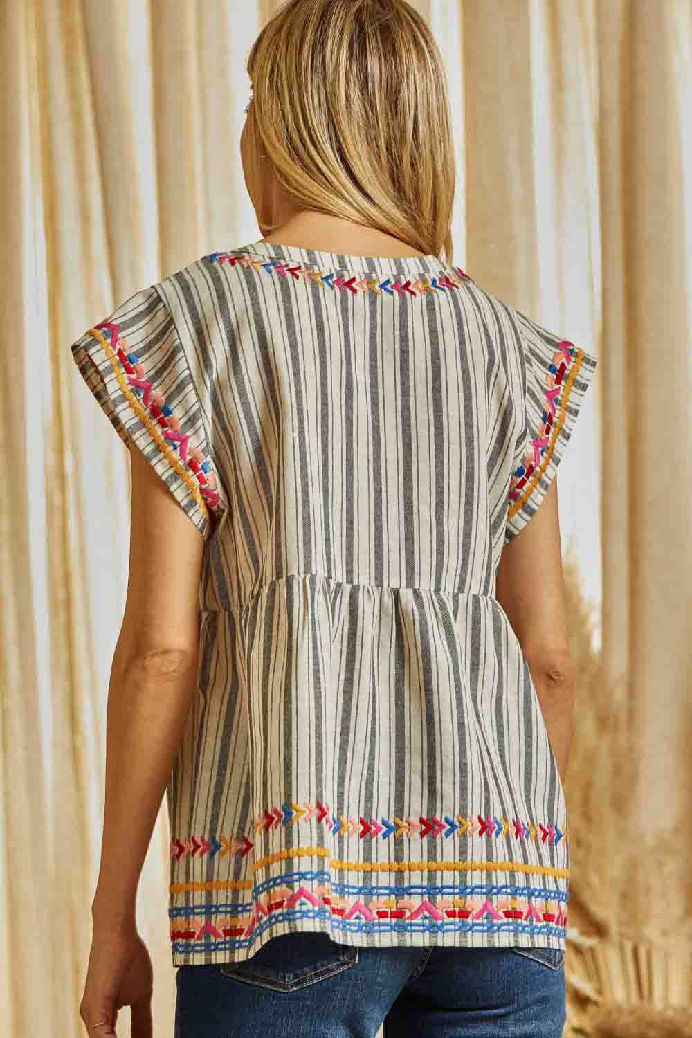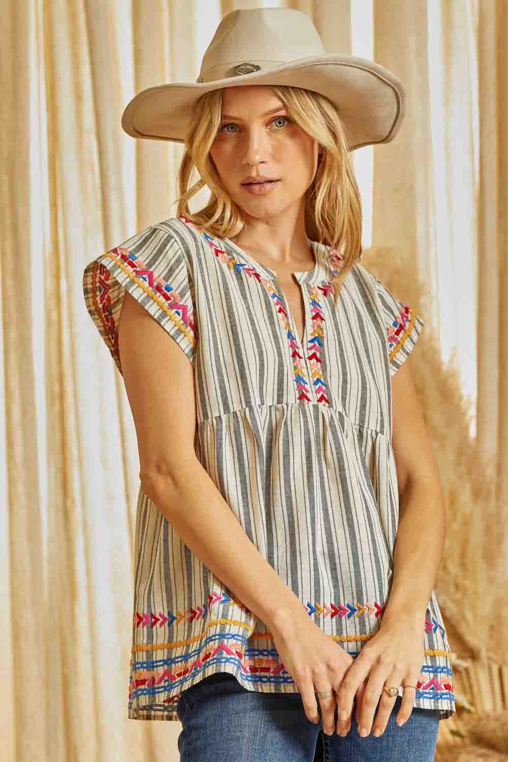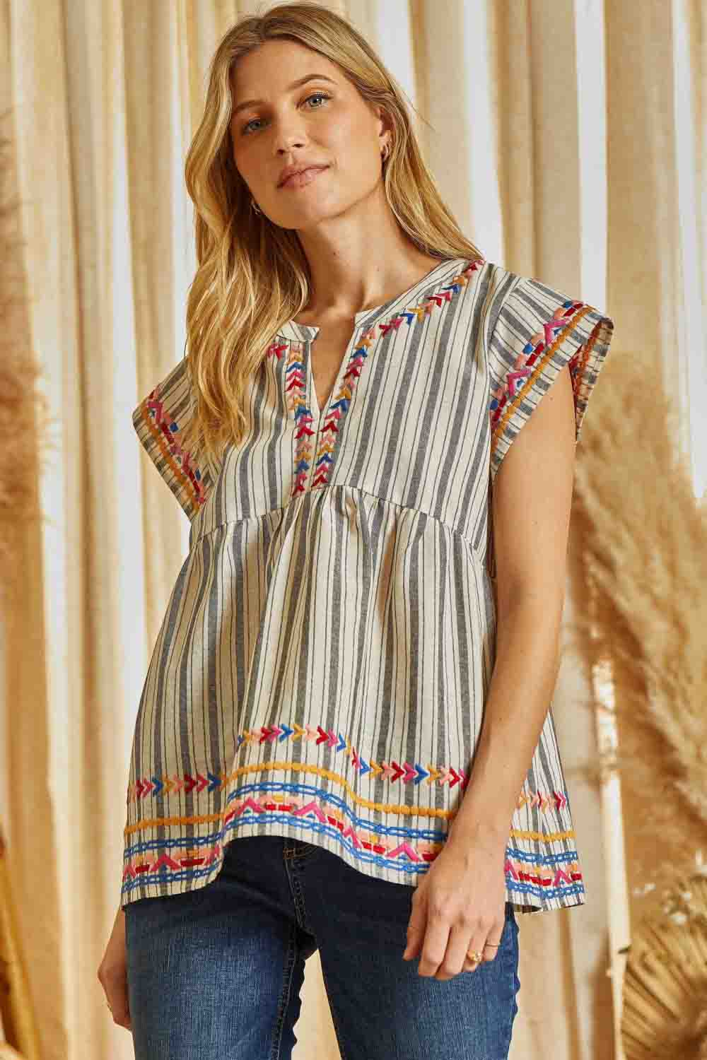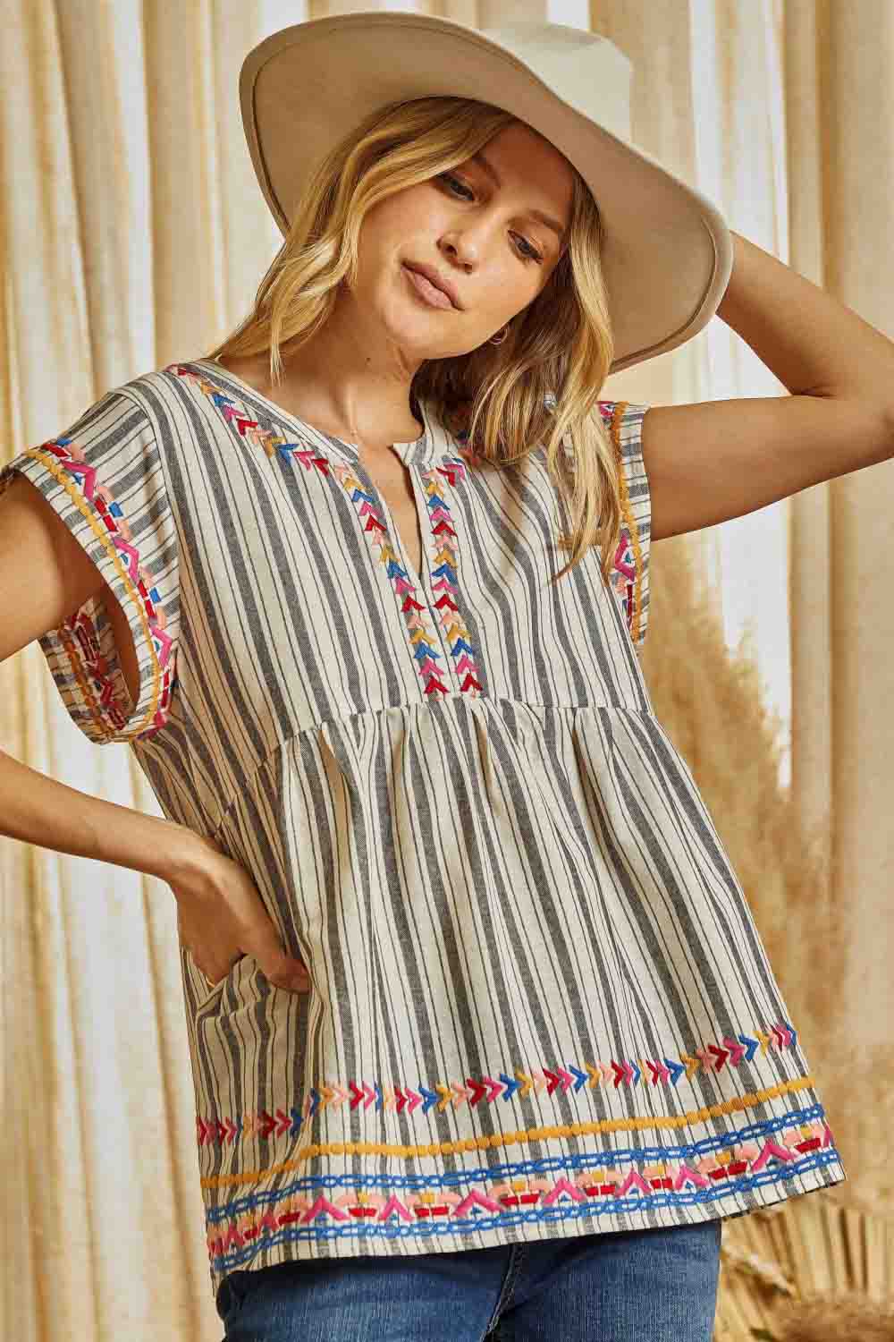 Striped babydoll linen top with Aztec embroidery, a split neckline and short sleeves.