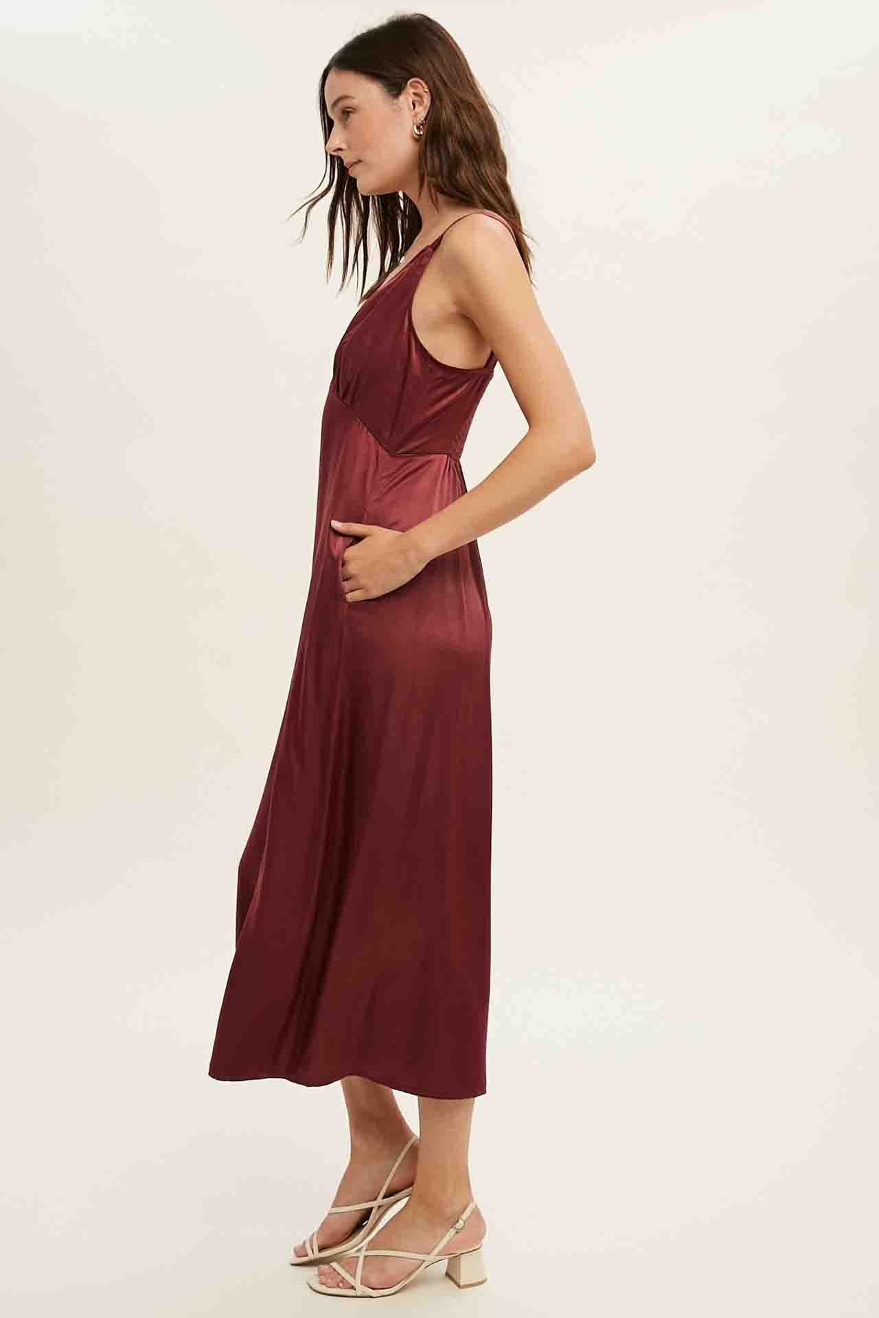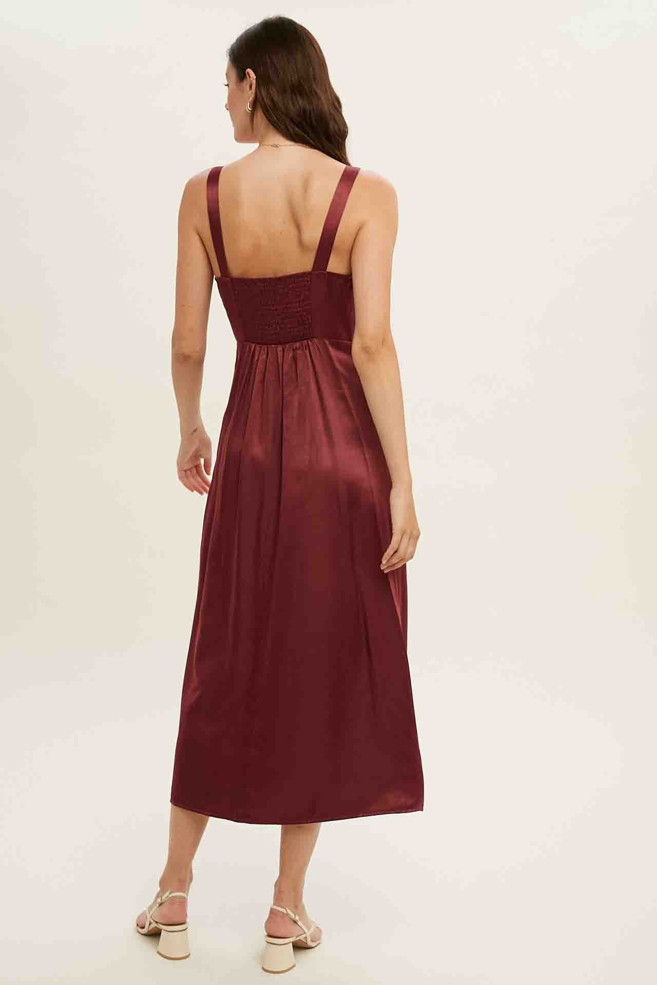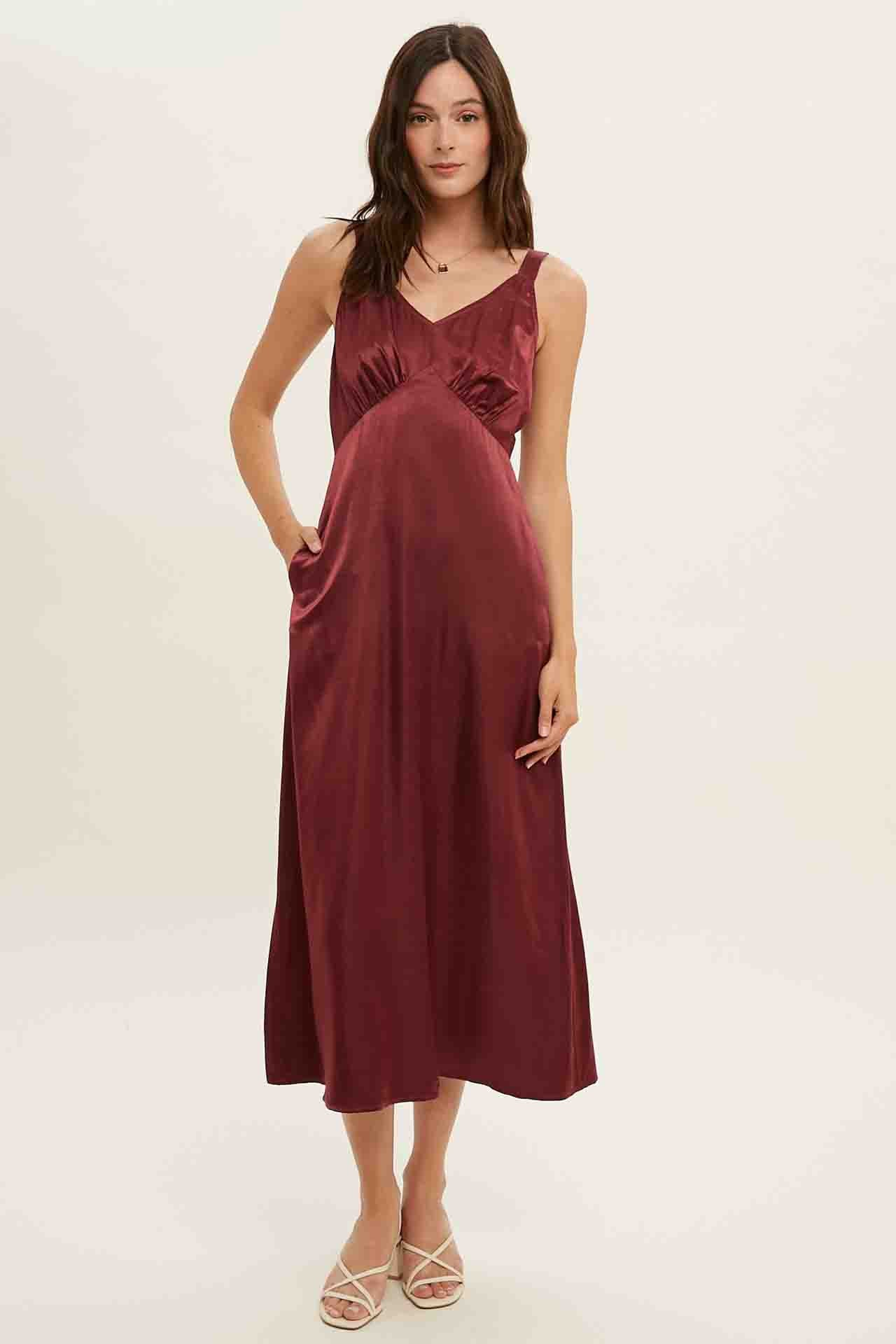 Satin midi dress with smocked back detail and side pockets, color is wine (maroon), by Wishlist Apparel.