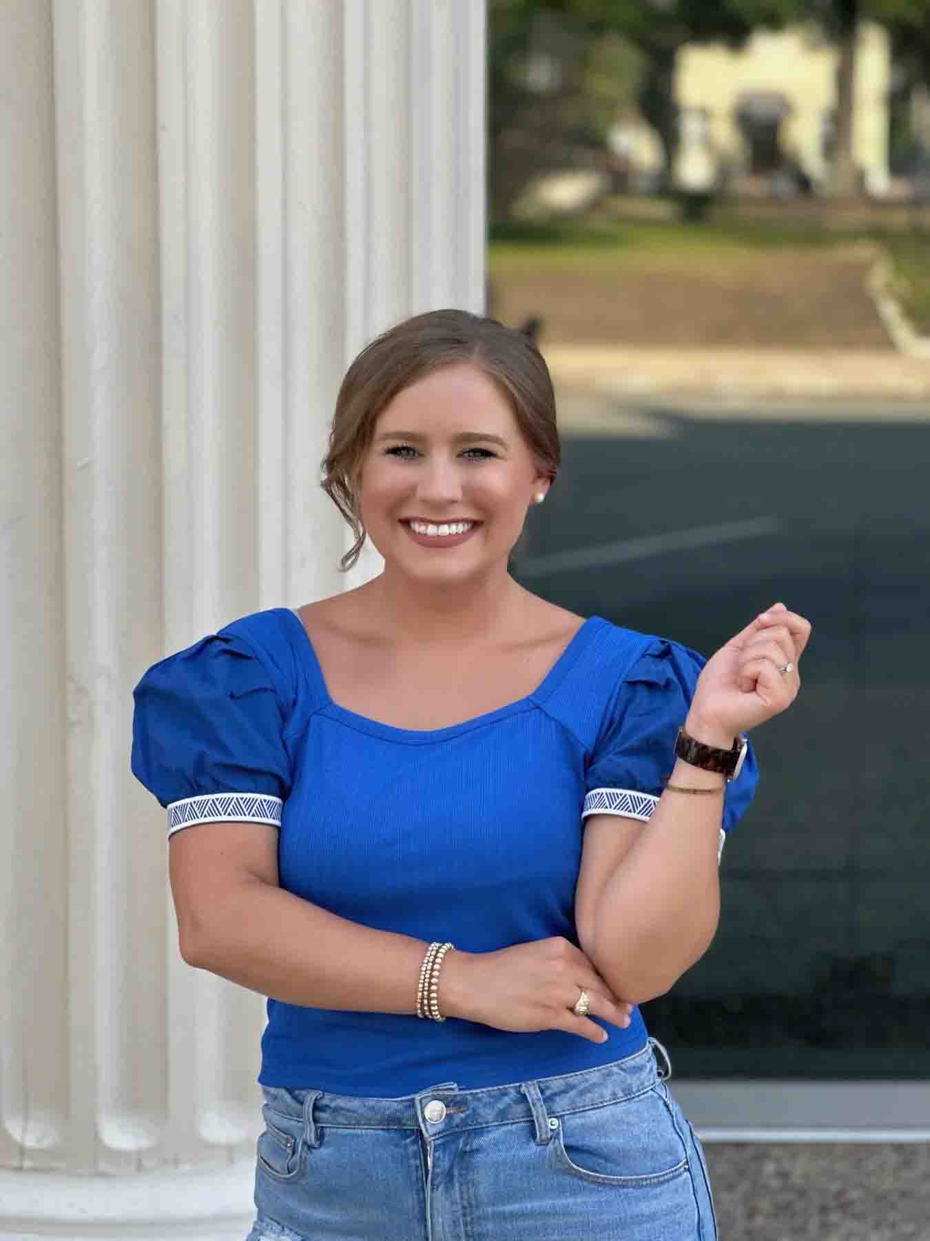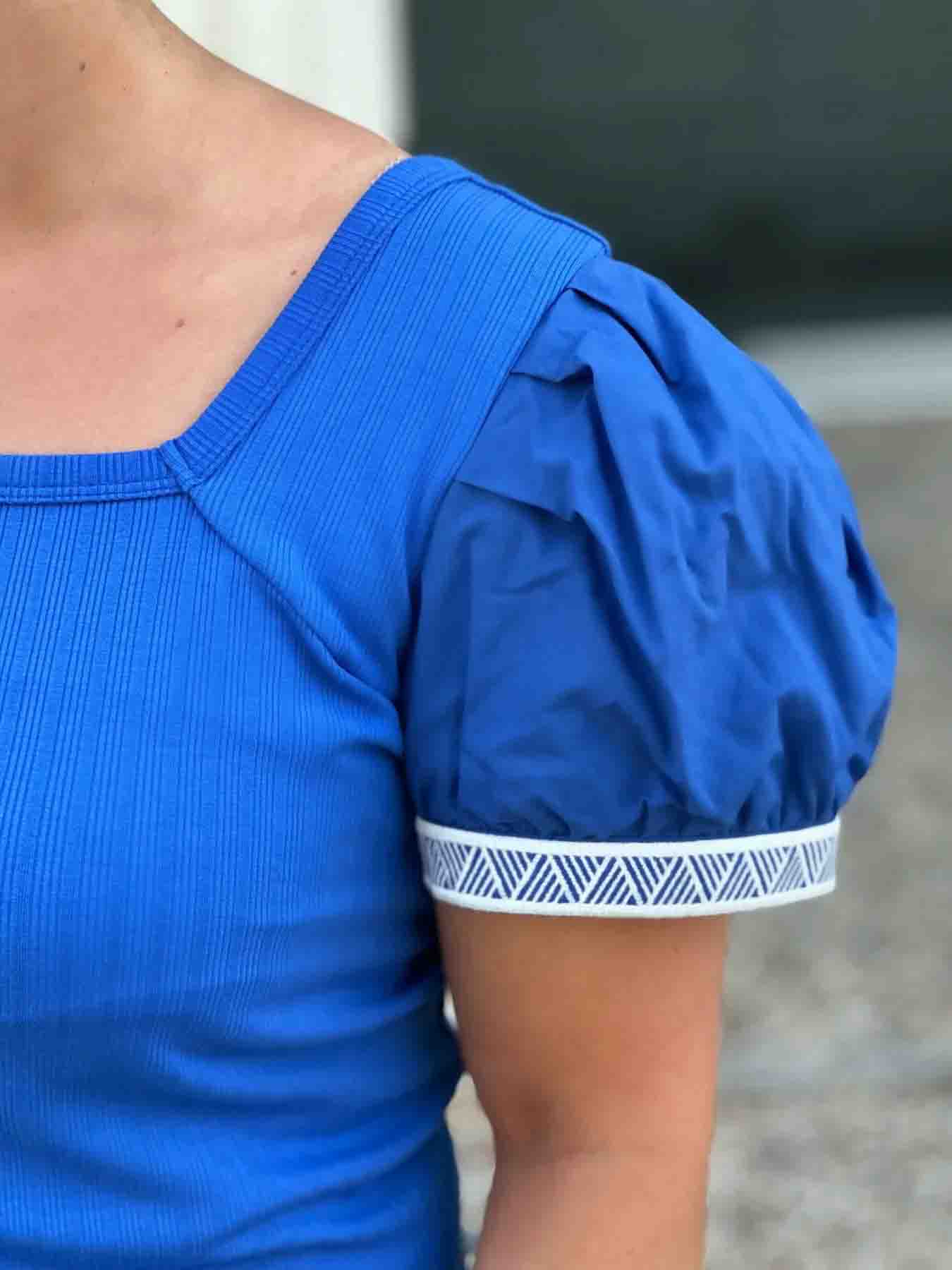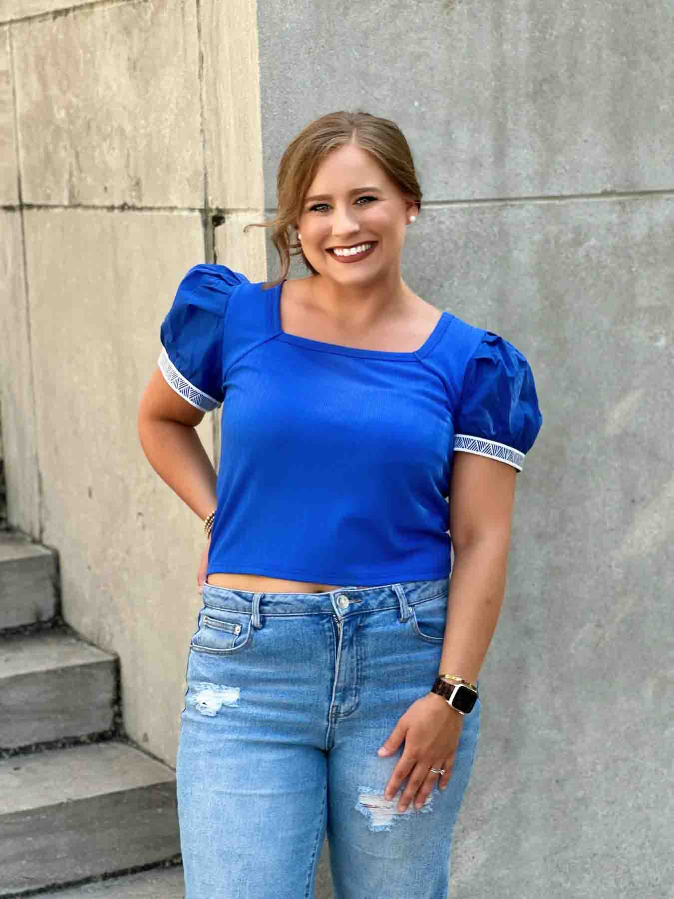 The Wrenlee Top is a hip-length fitted silhouette that'll go great with your high-rise jeans or cutoffs. And look at that dashing white embroidery design snaking around the sleeves - it's the perfect addition to your Game Day Collection!