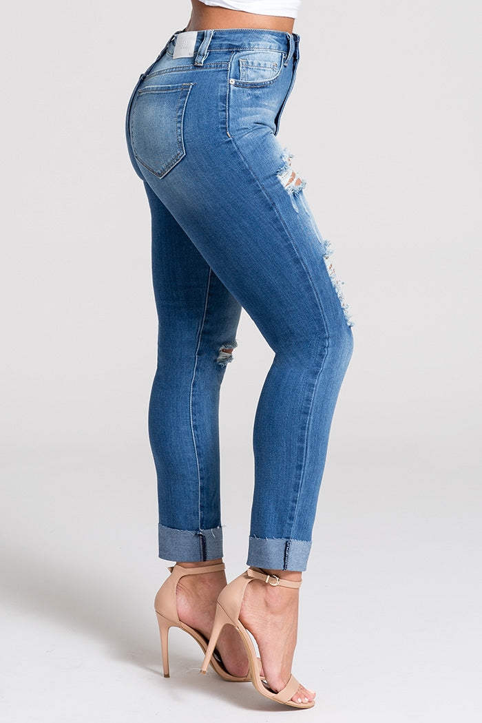 Rigid denim on the front with rip and tear destruction, comfortable butt-hugging stretch denim on the back, medium blue, high-rise ankle jeans, single-button closure with front zip, belt loops, raw edge cuffed ankle.